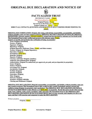 This document establishes an original factualized trust for [your full name] with an original depository reference number. Complete factualized trust online with us legal forms. This document appears to be declaring the establishment of an original, factualized trust for an individual named [name]. Easily fill out pdf blank, edit, and sign them.